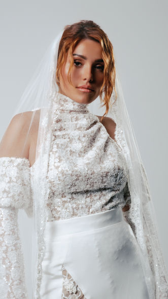 Combinaison short en tulle perlé et sequins, qui sublime un tulle au motif floral.